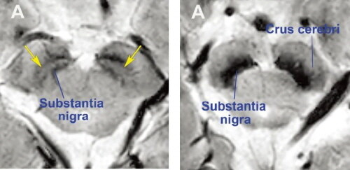 파킨슨 환자의 경우 건강한 사람보다 흑질의 부피가 더 많이 감소하는 경향을 보이므로, 이러한 변화가 확인될 경우 파킨슨병으로 진단하게 된다.