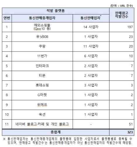 적발된 323곳 중 Qoo10 등 해외 쇼핑몰 197곳과 쿠팡, 11번가 등 국내 오픈마켓 75곳은 해외 구매대행, 해외 직구, 공동구매 등 판매·광고로 적발됐고 블로그·카페 51곳은 의약품 불법판매를 알선·광고해 적발됐다.