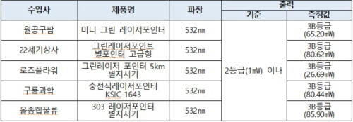 그러나 조사대상 별지시기·레이저포인터 6개 중 원공구팜 ‘미니 그린 레이저포인터’, 22세기상사 ‘그린레이저포인트 별포인터 고급형’ 등 5개 제품(83.3%)은 짧은 인체노출에도 눈·피부에 심각한 상해를 초래할 수 있는 3B등급의 레이저가 방출되어 기준에 부적합했다.