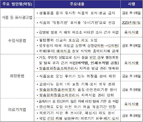 앞으로 생활용품으로 오인할 수 있는 식품의 표시ㆍ광고와 판매가 금지된다. 해외 수입식품 제조소, 맞춤형 화장품 관리제도, 사용단계에서의 의료기기 안전관리 등도 강화된다.