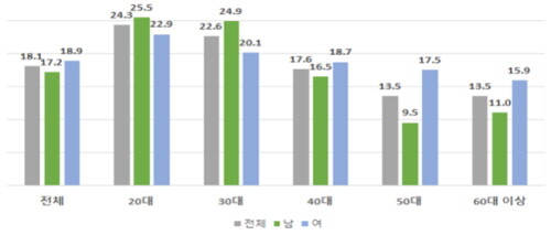 우울 점수는 20대 여성이 5.9점으로 모든 성별·연령대 중 가장 높았고, 우울 위험군 비율은 20대 남성이 25.5%, 30대 남성이 24.9% 순으로 모든 성별·연령대 중 가장 높았다.