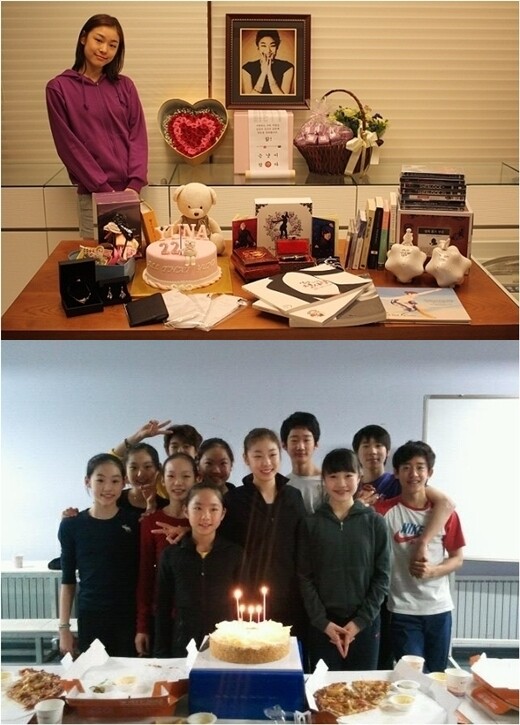 공개된 사진에는 팬들이 보내준 선물들이 진열되어 있는 테이블 뒤에서 행복한 미소를 띄고 있는 김연아의 모습이 담겨 있다.