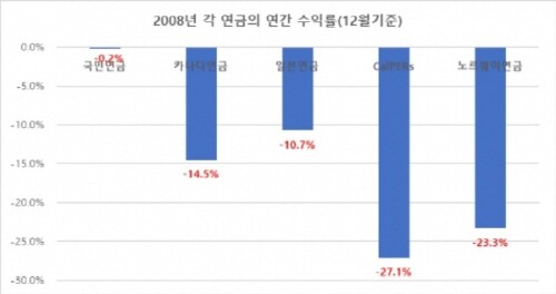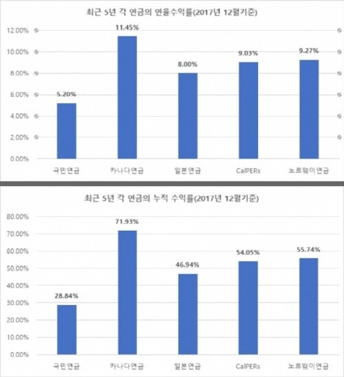 최근 5년간 연율 수익률(복리기준)기준으로 세계의 유수 연기금들의 수익률을 비교해본 결과 , 비교대상의 각국 연금들의 수익률이 국민연금 수익률에 비해 작게는 2.8%(일본), 크게는 6% 이상(캐나다연금) 높다.