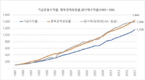 2018년 7월 30일 발표된 ‘국민연금기금 운용지침’에서 목표로 하는 장기 목표수익률(실질경제성장률+소비자물가상승률±조정치= 명목경제성장률) 4.67%와 국민연금 제3차 재정 추계시(2013년), 목표 수익률로 산정했던 회사채 수익률 2.77%(지난 5년 회사채AA- 토탈리턴 수익률)을 각각 0.53%와 2.43% 초과 달성한 수준이다.