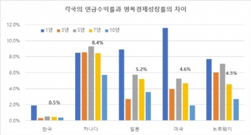 각국 연금의 연율수익률과 연율명목경제성장률(실질경제성장률+물가상승률)간의 차이를 보면 한국을 제외한 모든 국가들의 연금들이 자국의 명목 경제성장률을 훨씬 초과하는 수익률을 달성하고 있다.