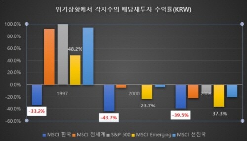이른바 IMF 위기라 불리우는 1997년 아시아 이머징 금융위기에는 선진국 시장과 전세계 시장과 별 상관이 없는 우리만의 위기였고 원화가치가 폭락했기 때문에 원화로 환산한 수익률은 한국시장만 -30%대를 경험했고, 다른 시장의 경우에는 원화로 투자했을 경우 90%-40%의 (+)수익률을 경험했다.