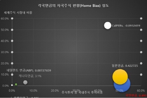 위의 그림은 각국 연기금 주식투자의 자국편향 정도를 나타낸 것이다. 한국시장은 MSCI All Country World(MSCI ACWI: 세계시장지수)에서 차지하는 비중이 1.6%인데, 국민연금은 전체 주식투자 중 51.2%를 국내주식에 투자해 자국편향 정도는 49.6%, 미국과 캐나다의 시장 비중은 각각 53.7%, 3.1%이며 자국 주식투자 비중은 각각 44.2%, 6.2% 이다.