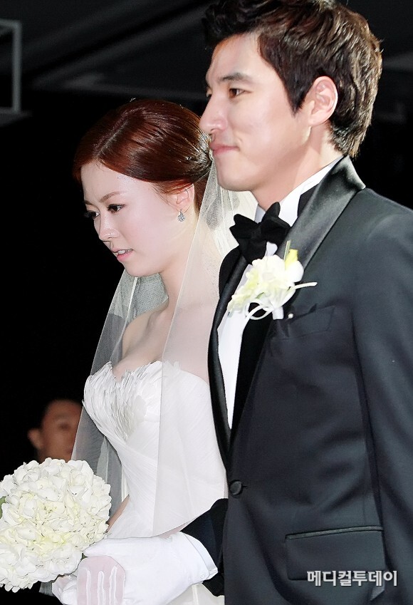 이날 튜브톱 드레스로 청초한 매력을 뽐낸 신부 김현희 씨에 이동준은 연신 긴장감 섞인 미소로 기쁨을 드러내 눈길을 끌었다.
