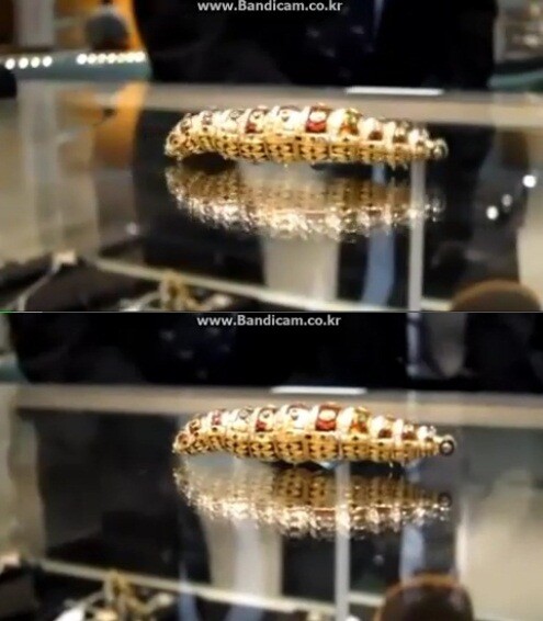 보도에 따르면 스위스 장인들이 만든 애벌레 모양의 보석 로봇은 '에티오피아 애벌레'(the Ethiopian caterpillar)로 불리고 있으며 총 11개의 관절로 이루어져 마디마다 수십 개의 진주 알과 루비, 터키석, 다이아몬드 등 다양한 보석이 장식됐다.