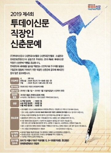2019 제4회 직장인 신춘문예는 투데이신문사, 한국사보협회, 한국문인협회 소설분과, 한국문화콘텐츠21이 공동 주최한다.