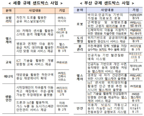 이번에 선정된 사업들은 세종은 모빌리티, 헬스케어, 교육, 에너지·환경, 생활·안전, 거버넌스, 문화·쇼핑, 일자리, 부산은 로봇, 배움·일·놀이, 도시행정, 물, 에너지, 교육, 헬스케어, 모빌리티, 안전, 공원 등이다.