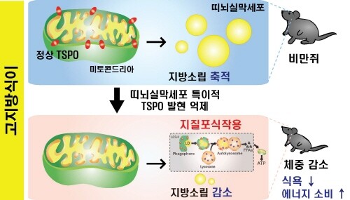 이 때 이 세포 내 TSPO를 억제하면 체내 에너지 항상성이 활성화되면서 지방소립을 분해하여 에너지는 얻는 지질포식작용(lipophagy)이 유도되어 지방소립이 에너지원으로 사용됨을 관찰했다.