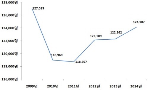 연평균 감소추세는 2009년부터 2011년의 감소에 의한 것으로 2012년 이후로는 꾸준히 증가하고 있다.