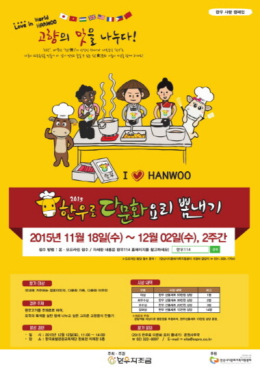 한우자조금관리위원회는 다가오는 연말 따뜻한 나눔 활동을 실천하기 위해 다문화 이주민 및 가족을 대상으로 ‘2015 한우로 다문화 요리 뽐내기’ 대회를 개최한다고 17일 밝혔다.
