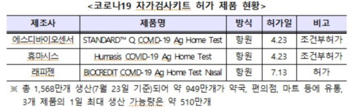 이에 따라 현재 국내에는 개인이 비강에서 검체를 채취하는 항원방식제품인 자가검사키트 3개가 허가되어 유통되고 있다. 총 1568만개 생산(7월 23일 기준)되어 약 949만개가 약국, 편의점, 마트 등에 유통, 3개 제품의 1일 최대 생산 가능량은 약 510만개로 파악됐다.