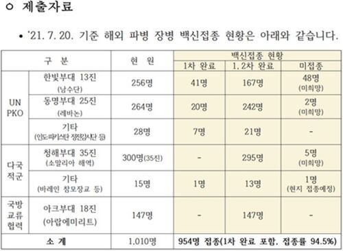 현재 해외로 파병된 장병 중 코로나 백신 미접종 장병은 총 56명에 달하는 것으로 확인됐다.