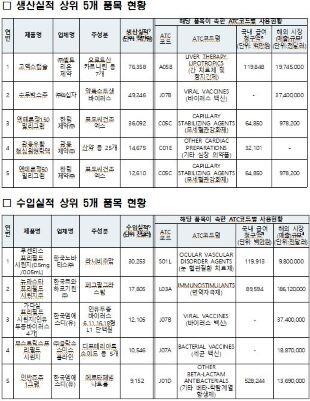 | ▲제네릭 미출시된 특허권 소멸 의약품 생산·수입실적 상위 5개 품목 현황 (사진= 식품의약품안전처 제공) |