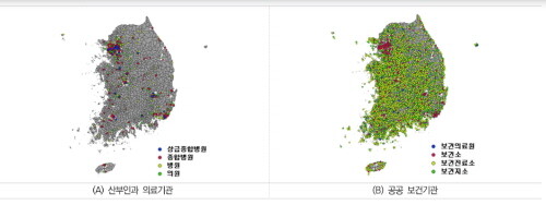 | ▲ 산부인과 의료기관 및 공공 보건기관 분포도 (자료= 한국보건사회연구원 제공) |