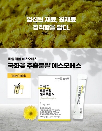 삼성에프앤비 관계자는 “원료 수입업체인 대덕약업의 원료공급 및 SCI급 논문 소개를 바탕으로 국화꽃추출분말 ‘에스오에스’를 출시하게 됐다”며, “이 제품은 1일 1스틱 물과 함께 온 가족이 간편하게 섭취가 가능하다”고 말했다.