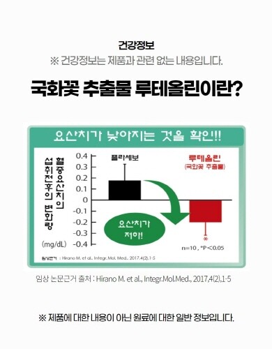 또 다른 SCI급 논문에 의하면 '루테올린'을 4주 동안 섭취했을 때 혈청 요산 수치가 감소했음을 발견할 수 있었으며, 그 배경으로는 다양한 식용 식물에서 발견되는 플라보노이드가 항 염증 및 통풍 방지 효과를 포함한 다양한 건강상의 이점을 나타냈기 때문으로 추측할 수 있다.