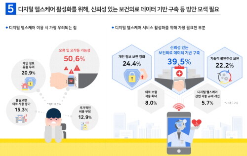 또한 디지털 헬스케어 이용 시 가장 우려되는 점으로 ‘오류 및 오작동 가능성’에 대한 우려가 50.6%로 가장 높았고, 이어 ‘개인 정보 유출 우려(20.9%)’, ‘불필요한 의료 사용 증가(15.3%)’ 등이 뒤를 이었다.