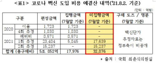 국민의힘 최춘식 의원이 질병관리청의 자료를 조사한 결과, 국회는 정부의 요구 등에 의하여 지난해와 올해에 추경 및 목적예비비 등을 통해 총 5조 852억원의 백신구매비 예산을 반영했지만, 정부가 8월 2일 기준 실제 집행한 금액은 전체(5조 852억원)의 35.3%인 1조 7976억원에 불과했다.