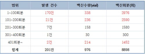 이어 한번에 300회분 이상 폐기하는 경우도 1건 있었으며, 400회분 이상으로 폐기된 사례도 2건 보고되어 각각 1032회분과 420회분의 백신이 한꺼번에 폐기됐다.