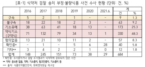 식약처에서 검찰 송치된 684건 가운데 82.8%…불구속‧기소유예‧약식기소