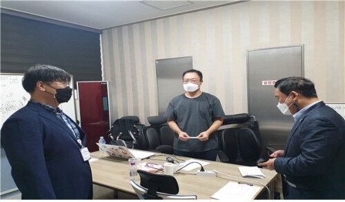| ▲ 임희택 원장(오른쪽)이 김성훈 본부장(왼쪽) 등 관련자를 격려하고 있다.(오송, 민관 합동 특별 전담 TF) (사진= 한국사회보장정보원 제공) |