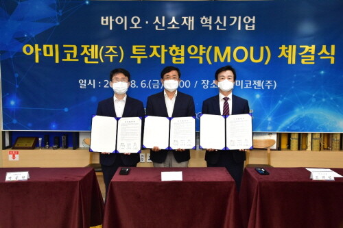 아미코젠은 6일, 아미코젠 문산 제2공장에서 박종원 경상남도 경제부지사와 조규일 진주시장, 신용철 아미코젠 대표이사 등 관계자들이 참석한 가운데 바이오신소재 혁신기업 투자협약(MOU)을 체결했다고 밝혔다.