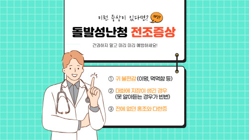 즉 최대한 예방하는 것이 가장 좋은 방법이란 말이 된다. 하지만 그게 쉽지 않다. 왜냐하면 내가 문제가 있는 상황인지 알기가 쉽지 않기 때문이다. 본인의 청력 변화를 인지하는 것이 그리 쉽지 않다는 말이다. 그래도 급격한 난청으로 이어질 수 있는 여러 가지 전조증상들을 확인할 수 있으며, 본인이 해당된다면 간과하지 말고 검사와 치료를 진행하려는 노력이 필요하다.