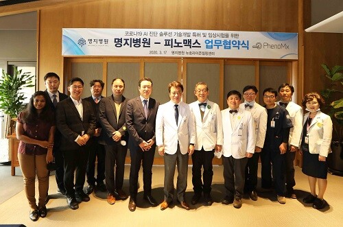 명지병원과 피노맥스는 지난 17일 오후 병원 B관 5층 뉴호라이즌힐링센터에서 코로나19 인공지능 서비스 연구개발 및 임상시험을 위한 상호 업무협력 협약을 체결하고 공동 연구개발에 착수했다.