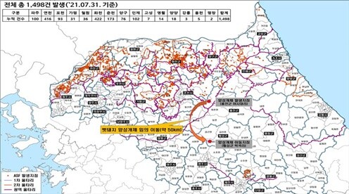 | ▲아프리카돼지열병 발생현황 및 거짓신고 임의이동 도면 (자료=환경부 제공) |