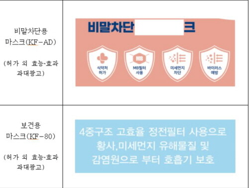또한 의약외품 마스크가 아닌 공산품 마스크에 대해 ‘황사·미세먼지 차단’, ‘비말차단’, ‘유해물질 차단’ 등으로 광고·표시해 의약외품 마스크로 오인할 우려가 있는 허위광고 28건도 적발했다.