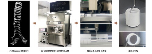 | ▲사람 기관 CT이미지를 활용하여, GMP내의 3D프린터로 프린팅하여 ‘3D세포프린팅 기관(trachea)’를 제작 (사진=한국보건산업진흥원 제공) |