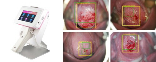 | ▲ 엔티엘 자궁경부확대촬영기기 C20(좌), 인공지능 진단 자궁경부 이미지: AI 결과 및 이상 병변 감지(우) (사진=엔티엘헬스케어 제공) |