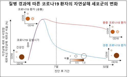 | ▲질병 경과에 따른 코로나19 환자의 자연살해 세포군의 변화 (사진=KAIST 제공) |