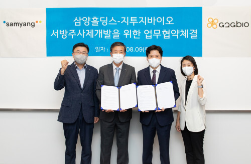| ▲삼양홀딩스 바이오팜그룹과 지투지바이오가 9일 판교 삼양디스커버리센터에서 서방형 주사제 제품 개발을 위한 양해각서를 체결했다 (사진=삼양홀딩스 제공) |