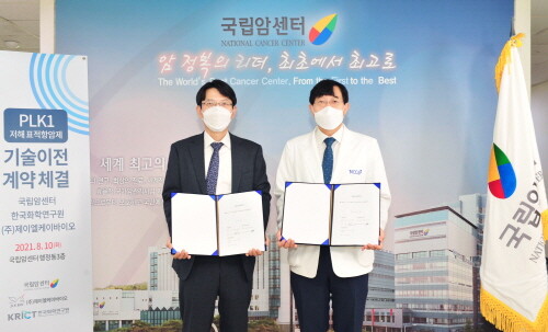 국립암센터와 한국화학연구원은 10일 제이엘케이바이오와 PLK-1 저해 표적항암제에 대한 기술이전 협약을 체결했다.