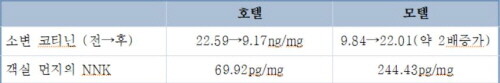 모텔 투숙객들의 소변 내 코티닌 농도는 9.84ng/㎎에서 22.01g/㎎으로 2.2배 증가한 반면 호텔 투숙객들의 소변 내 코티닌 농도는 22.59ng/㎎에서 9.17ng/㎎으로 오히려 감소한 것으로 집계됐다.