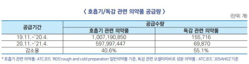 구체적인 기간은 2019년 11월부터 지난해 4월까지 호흡기 관련 의약품 공급수량은 10억719만850개로 집계됐다. 반면 지난해 11월부터 올해 4월까지는 40.6% 줄어든 5억9799만7447개로 나타났다.