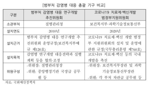 아울러 국회예산처는 기존의 감염병 R&D컨트롤타워인 ‘범부처 감염병 대응 연구개발 추진위원회’와의 효과적인 역할분담의 필요성도 제기했다.