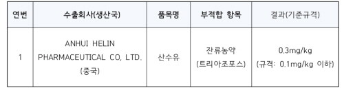 산수유 1건은 트리아조포스 잔류농약 기준을 초과해 수입통관 단계에서 차단하는 등 사전에 유통되지 않도록 조치했으며 향후 동일 제품이 수입되는 경우 정밀검사(5회)를 실시해 안전성 확인 절차를 더욱 강화한다는 방침이다.