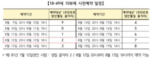 | ▲ 18~49세 10부제 사전예약 일정 (사진= 질병관리청 제공) |