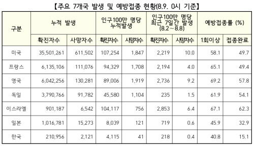 | ▲ 주요 7개국 발생 및 예방접종 현황 (사진= 질병관리청 제공) |