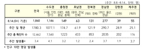 중앙방역대책본부는 14일 0시 기준 국내 발생 신규 확진자는 1860명이며(최근 1주간 일 평균 1780.3명), 수도권에서 1146명(61.6%), 비수도권에서 714명(38.4%) 발생했다고 밝혔다.