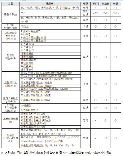 화학물질 유통량 및 해외의 인체조사(바이오모니터링) 항목, 전문가 의견 등을 반영하여 국제적으로 유해성 우려가 높은 잔류성유기오염물질(POPs) 25종을 새로 추가했으며, 중금속 물질을 3종에서 9종으로 늘렸다.