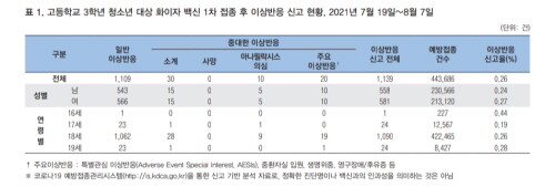 질병청, 고3 청소년 대상 화이자 백신 1차접종 후 이상반응 신고현황 공개