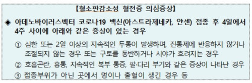 | ▲혈소판감소성 혈전증 의심증상 (사진=질병관리청 제공) |