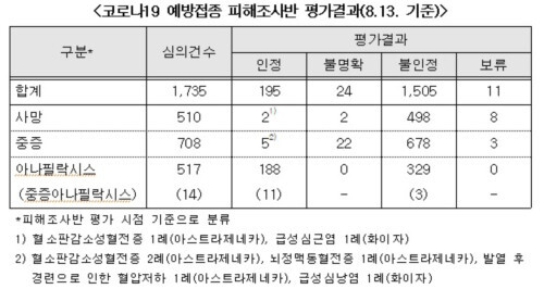 신고사례 총 1735건(사망 510건, 중증 708건, 아나필락시스 517건) 중 195건(사망 2건, 중증 5건, 아나필락시스 188건)이 예방접종과의 인과성이 인정되었고, 24건(사망 2건, 중증 22건)은 근거가 불명확한 사례로 평가됐다.